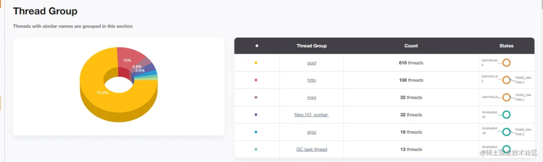 但是敏锐的我还是立刻意识到这个应用有不妥,因为线程数太多了,不符合我们一个正常健康的应用数量。熟练的打出 cpu dump 观察,首先看线程组名的概览。