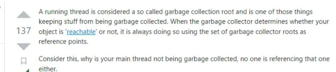 这句话的意思是,一条正在运行的线程是 gc root,注意,是正在运行,这个正在运行我先透露下,即使是 waiting 状态,也算正在运行。这个回答的整体的意思是,运行的线程是 gc root,但是非运行的线程不是 gc root(可以被回收)。