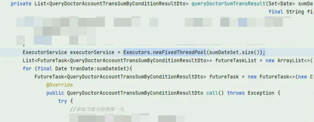 冷静下来后我梳理一遍代码,这个接口是我两年前写的,主要是功能是统计用户的钱包每个月的流水,因为担心统计比较慢,所以使用了线程池,做了批量的处理,没想到居然导致了线程数过高,虽然没有导致事故,但是确实是潜在的隐患,现在没出事不代表以后不会出事。