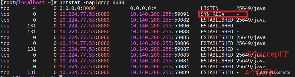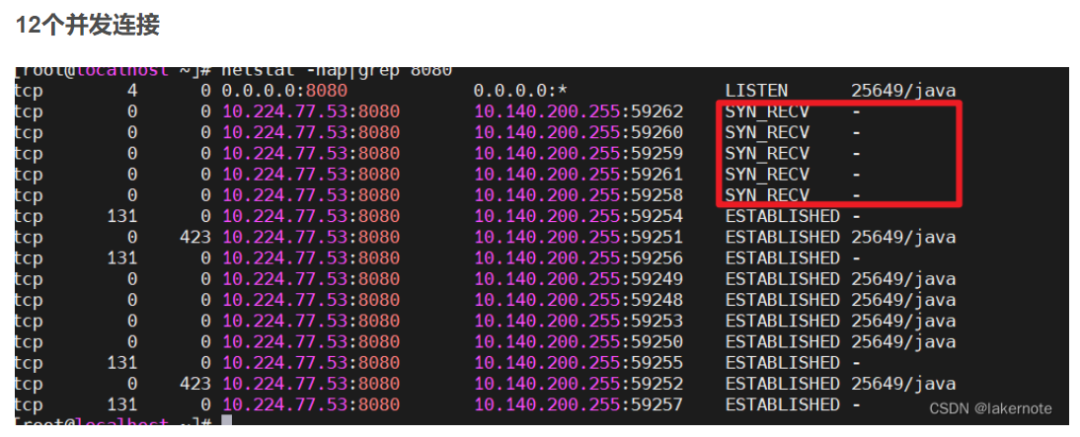 所以我们可以看到,当有 11 个并发连接,即超出最大的 10 个连接后,会有个连接一直停留在 SYN_RECV 状态,不会完成 3 次握手了。