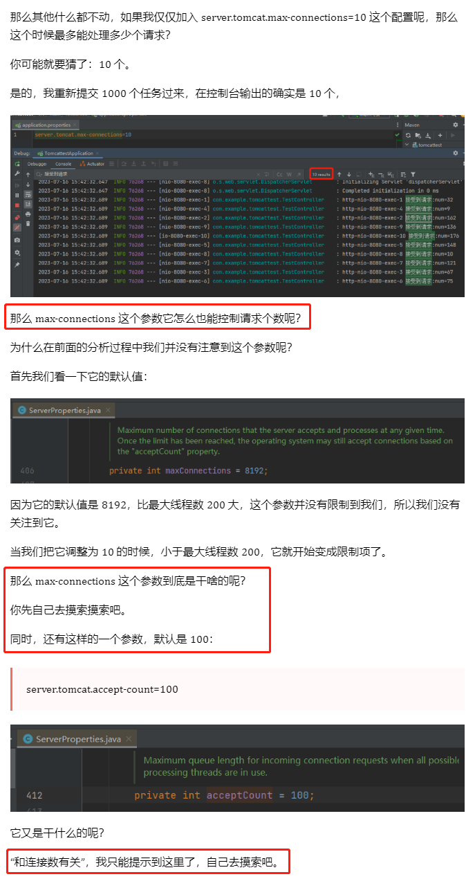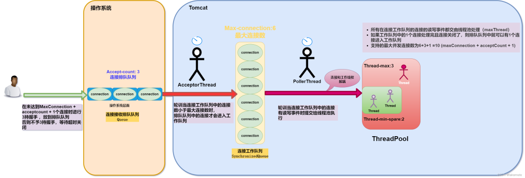 但是当面试官问“一个 SpringBoot 项目能接受多少个连接”的时候,我们就不得不聊到刚刚提到的这两个参数了。