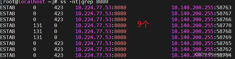 针对 9 个并发连接的场景,补充个 netstat,显示一下网络相关信息: