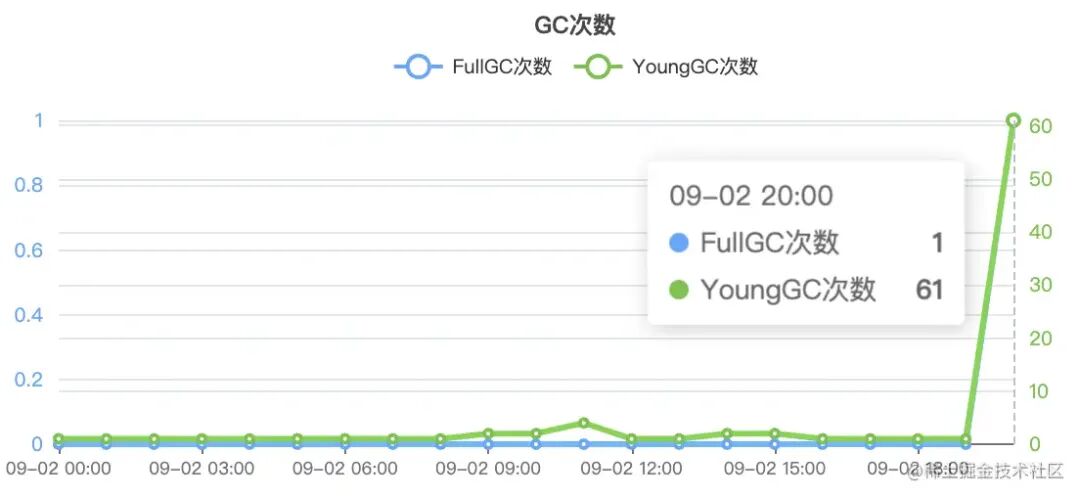 首先问题是这样的,周五正在写文档,突然收到了线上报警,发现cpu占用达到了90多,上平台监控系统查看容器,在jvm监控中发现有一个pod在两个小时内产生了61次youngGc一次fullGc,这个问题特别严重且少见,由于我之前也没有排查过此类问题,所以也是百度,但整个过程也有一些自己的思考,所以跟大家分享一下~