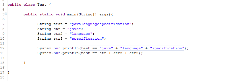 从上面的例子可以看出,字符串常量在编译时计算和在运行时计算,其执行过程是不同的,得到的结果也是不同的。我们来看看下面这段代码: