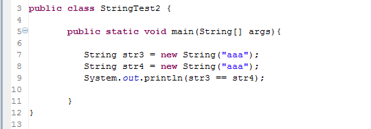 因为,采用new关键字创建对象时,每次new出来的都是一个新的对象,也即是说引用str3和str4指向的是两个不同的对象,因此语句System.out.println(str3 == str4)输出:false。