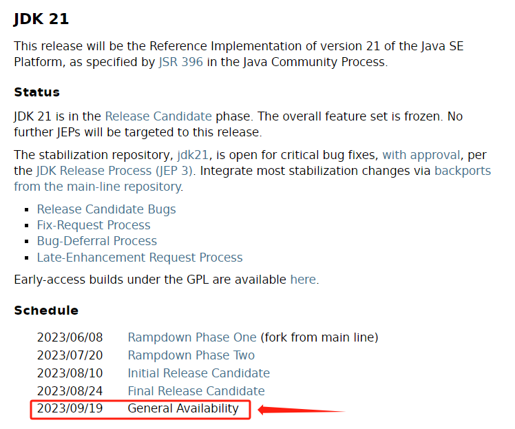 朋友们,好消息,好消息,从今年年初就一直在喊的具有革命性、未来性、开创新纪元的 JDK 21 按照官方的时间计划表,今天终于是要正式 GA 了: