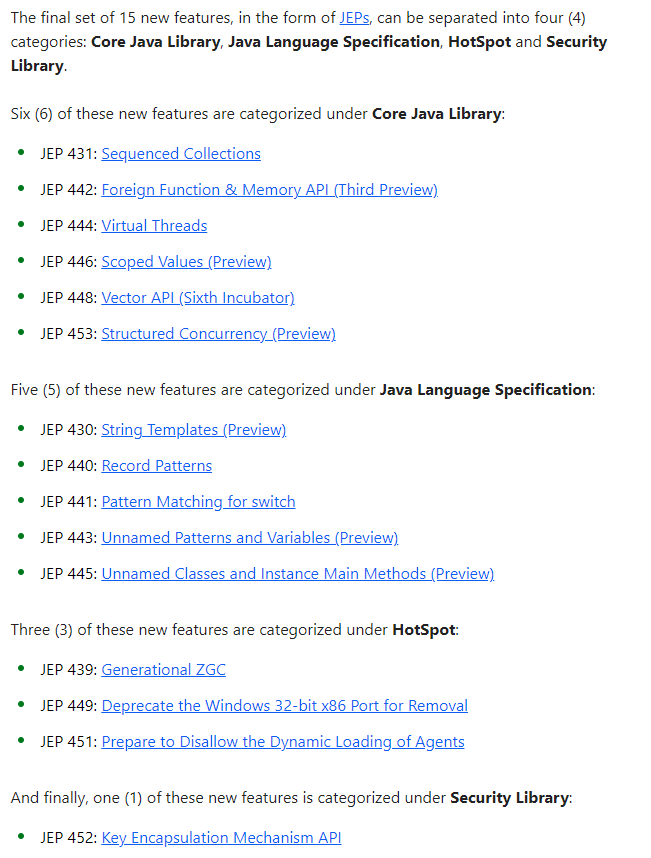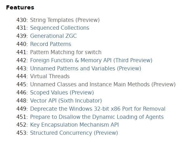 说会到 JDK 21 今天的 GA 版本,一共发布了 15 个新特性: