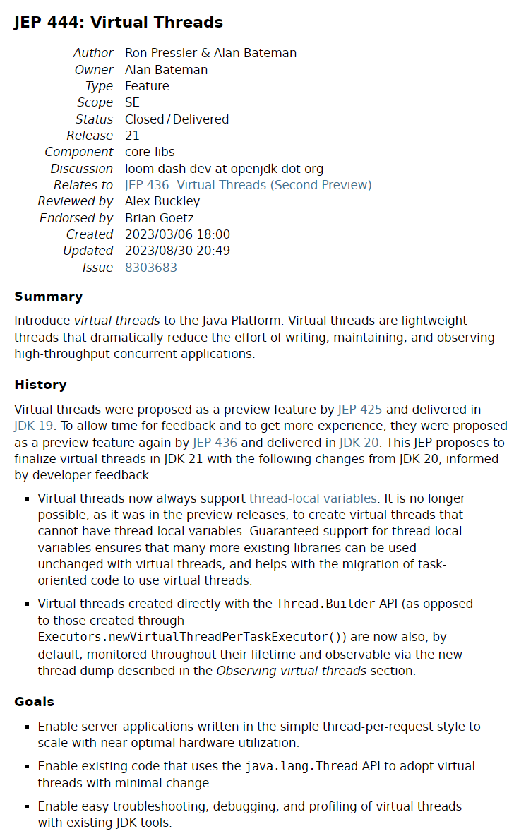 一眼望去,其中最扎眼的,也是描述最短的一个 Feature 是 444 号 Virtual Threads: