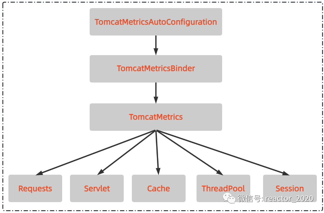 Tomcat 监控指标通过自动装配配置类加载,主要核心逻辑都在 TomcatMetrics 这个类中: