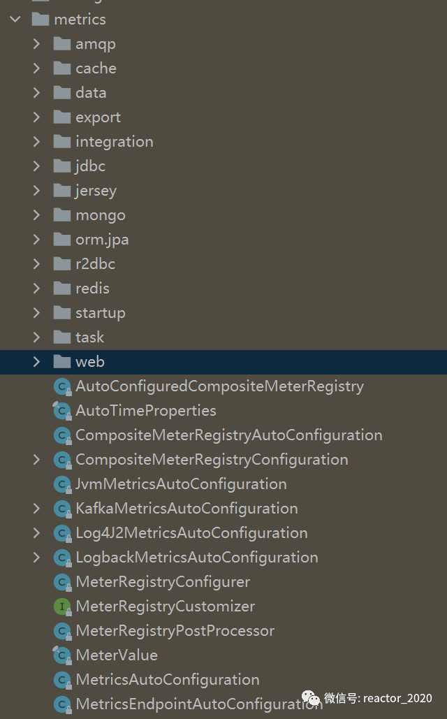 从类名称上来看,这里涉及到大量指标装配,如jvm、kafka、log4j2、logback、rabbitmq、redis缓存、jdbc、web等等相关。