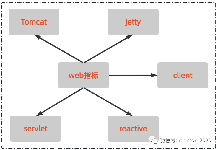 web指标主要分为5类,首先是 server 容器类指标,包括 tomcat 和 jetty,然后就是web应用类型是基于 servlet 还是 reactive,client 则是提供对如RestTemplate 客户端访问工具提供监控指标支持。