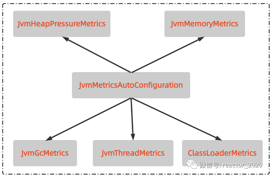 Jvm 相关指标通过 JvmMetricsAutoConfiguration 配置类自动装配,涉及到5类指标,分别对应下面5个类:
