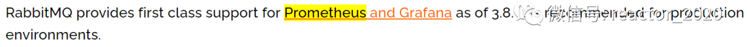 RabbitMQ 从 3.8.0 开始,也开始提供内置的 Prometheus、Grafana 支持,官网明确建议将该特性使用到生产环境中(见下图),监控指标说明以及官网提供的Grafana Dashboard 详见:https://www.rabbitmq.com/prometheus.html。