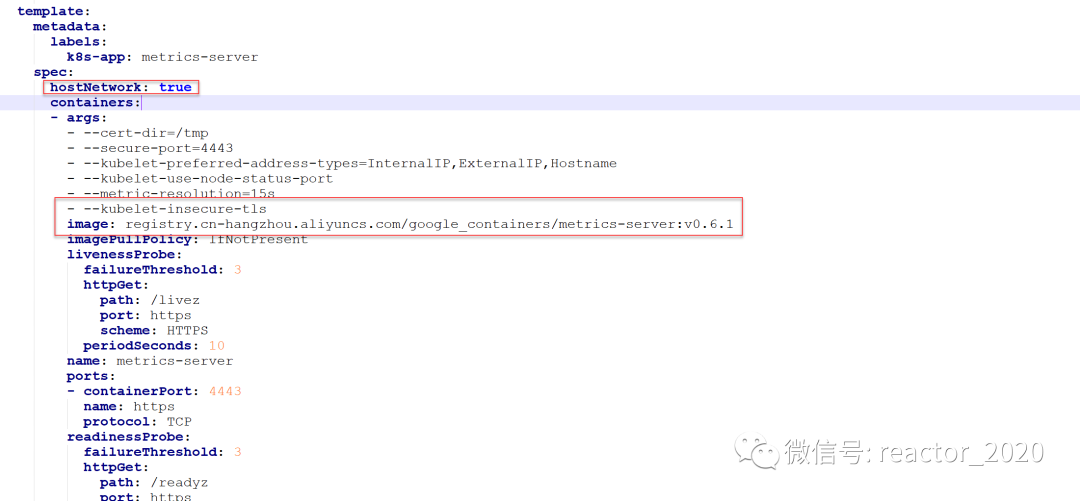 1、如果需要忽略 Kubelet certificate ,name只需要在 deployment 的containers.args 中加上 –kubelet-insecure-tls 即可 2、如果在国内,需要将镜像仓库更改为国内的源,例如阿里云的,例如将 k8s.gcr.io/metrics-server/metrics-server 更改为 registry.aliyuncs.com/google_containers/metrics-server。