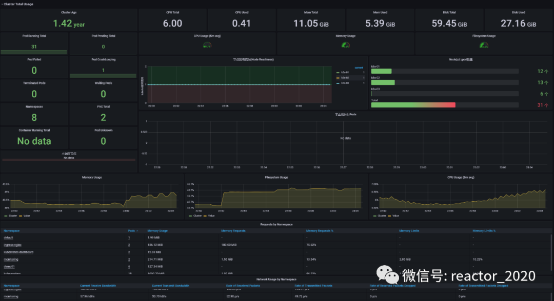 b、如集群中各种资源对象统计,比如各种状态Pod数量统计、namespace数量、pvc数量、node节点上运行pod统计,namespace资源申请统计等等。