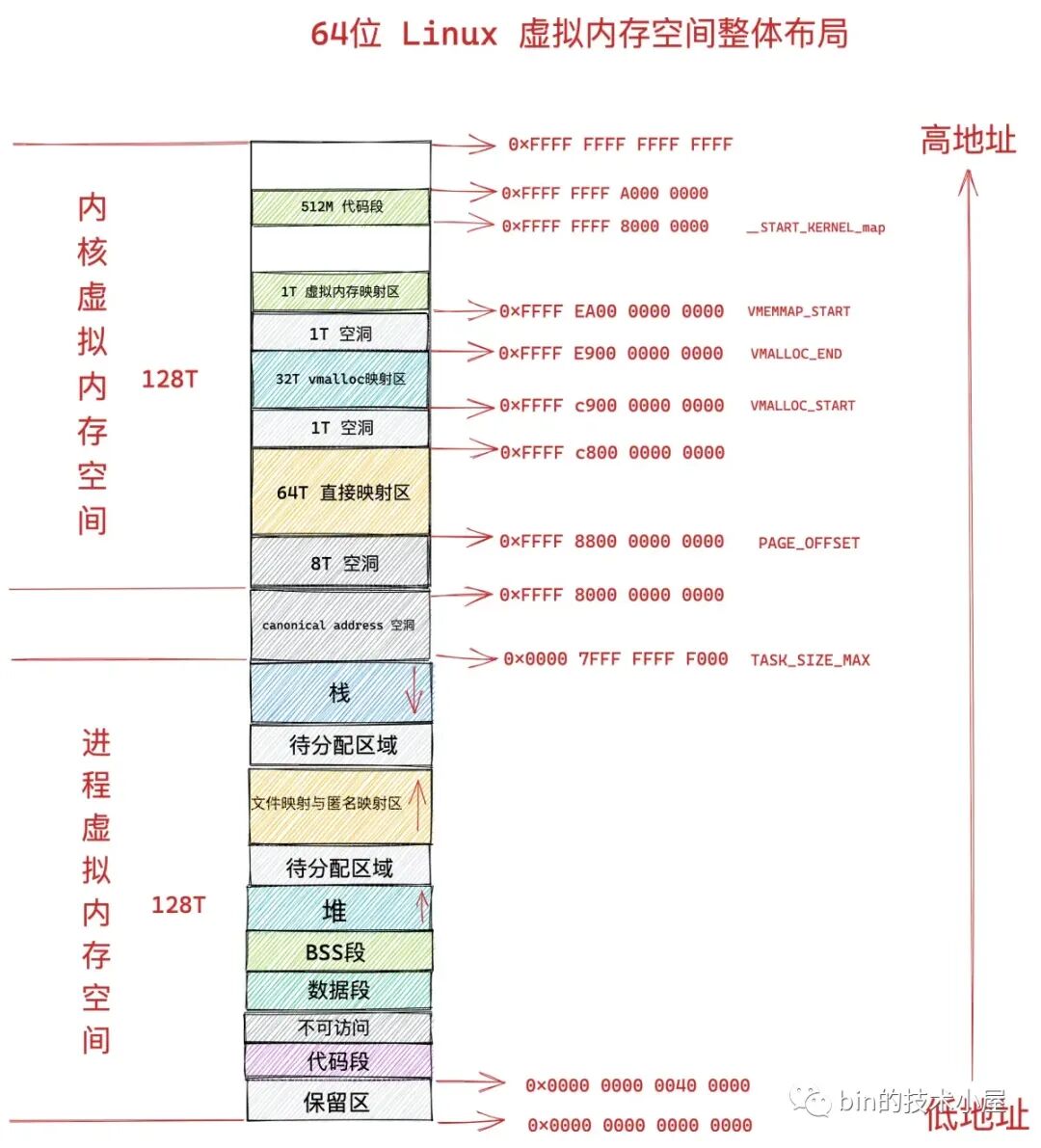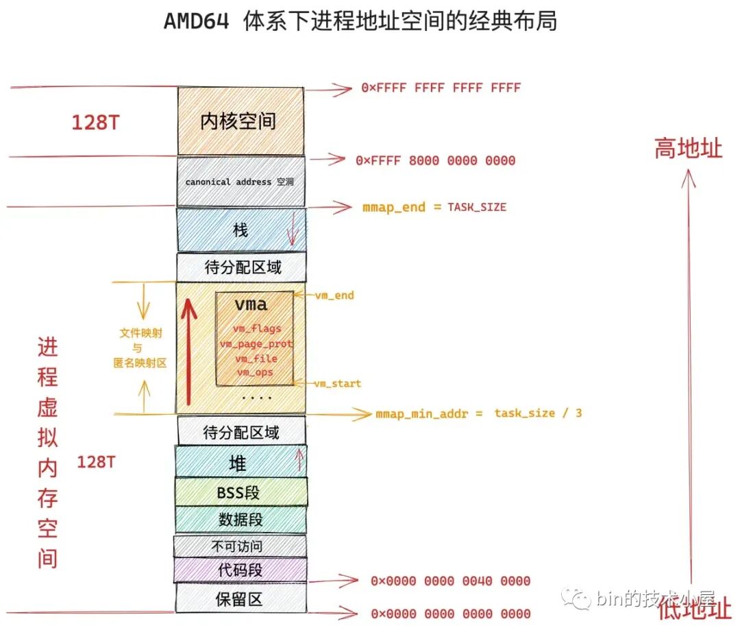 在 64 位体系结构下,进程虚拟内存空间总体上分为两个部分,一部分是 128T 的用户空间,地址范围为:0x0000 0000 0000 0000 - 0x0000 7FFF FFFF FFFF 。但实际上,Linux 内核是用 TASK_SIZE_MAX 来定义用户空间的末尾的,也就是说 Linux 内核是使用 TASK_SIZE_MAX 来分割用户虚拟地址空间与内核虚拟地址空间的。
