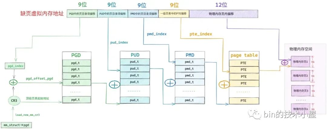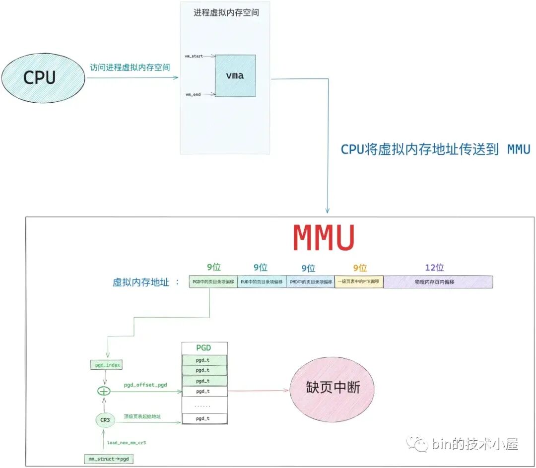 由于现在被访问到的虚拟内存地址对应的 pgd_t 是空的,进程的四级页表体系还未建立,所以 MMU 会产生一个缺页中断,进程从用户态转入内核态来处理这个缺页异常。