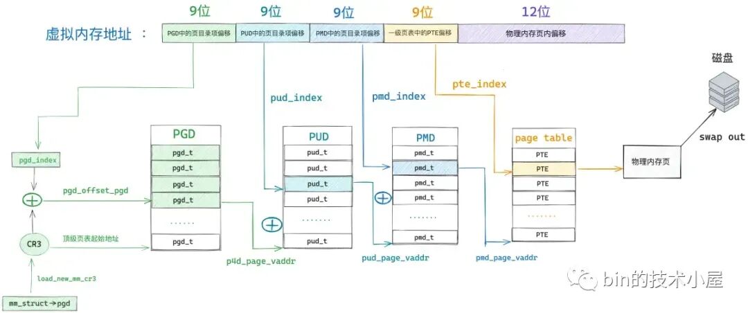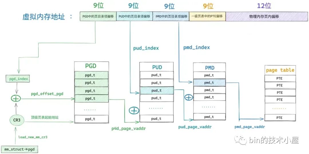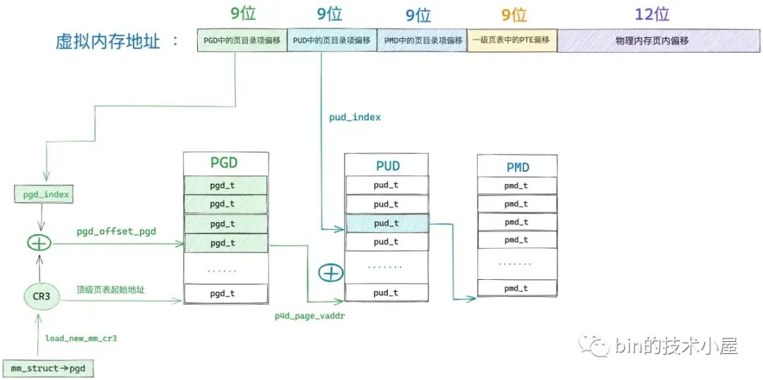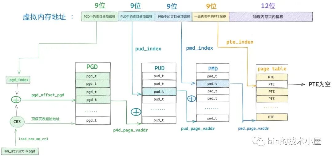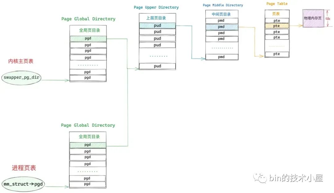 也就是说,此时进程页表中只有一张顶级页目录表 PGD,而上层页目录 PUD(Page Upper Directory),中间页目录 PMD(Page Middle Directory),一级页表(Page Table)内核都还没有创建。