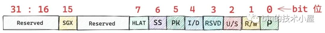 RSVD(3):这里用于检测页表项中的保留位(Reserved 相关的比特位)是否设置,这些页表项中的保留位都是预留给内核以后的相关功能使用的,所以在缺页的时候需要检查这些保留位是否设置,从而决定近一步的扩展处理。设置为 1 表示页表项中预留的这些比特位被使用了。设置为 0 表示页表项中预留的这些比特位还没有被使用。