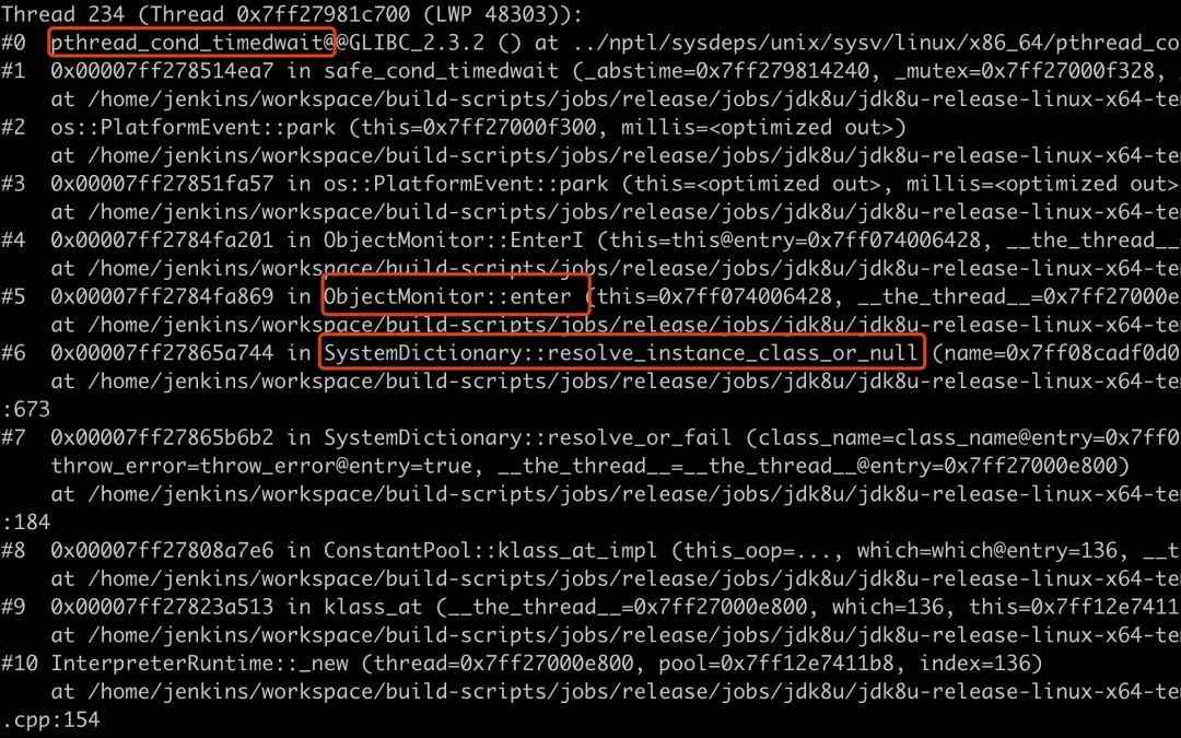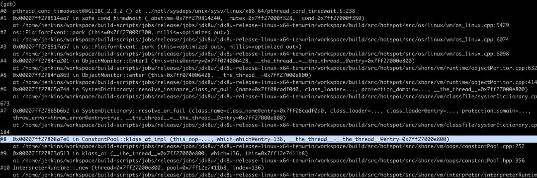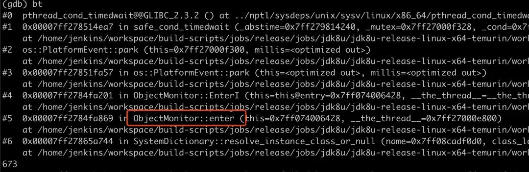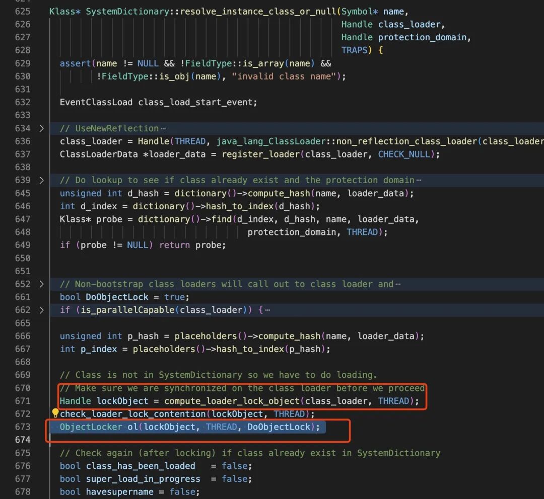 可以看到其中这个线程正在调用 SystemDictionary::resolve_instance_class_or_null 为了获取对象锁进入了等待状态,对应的代码行在 673 行,如下:
