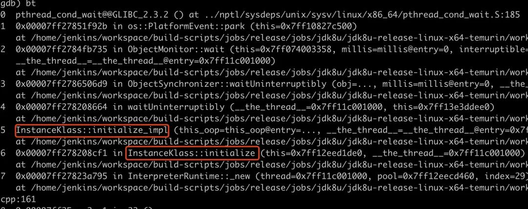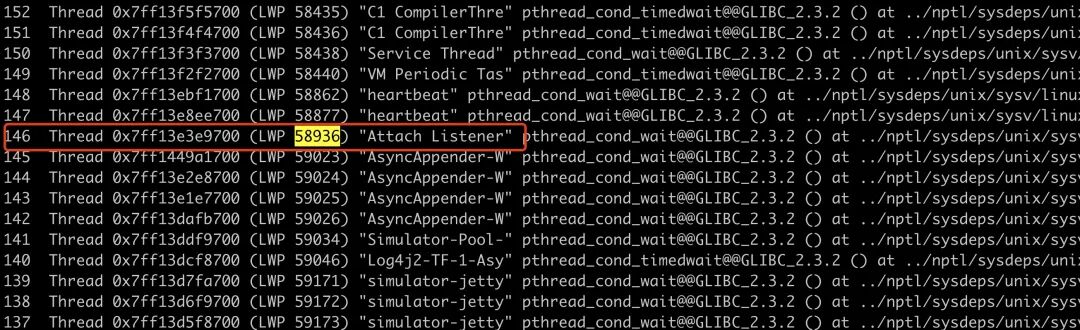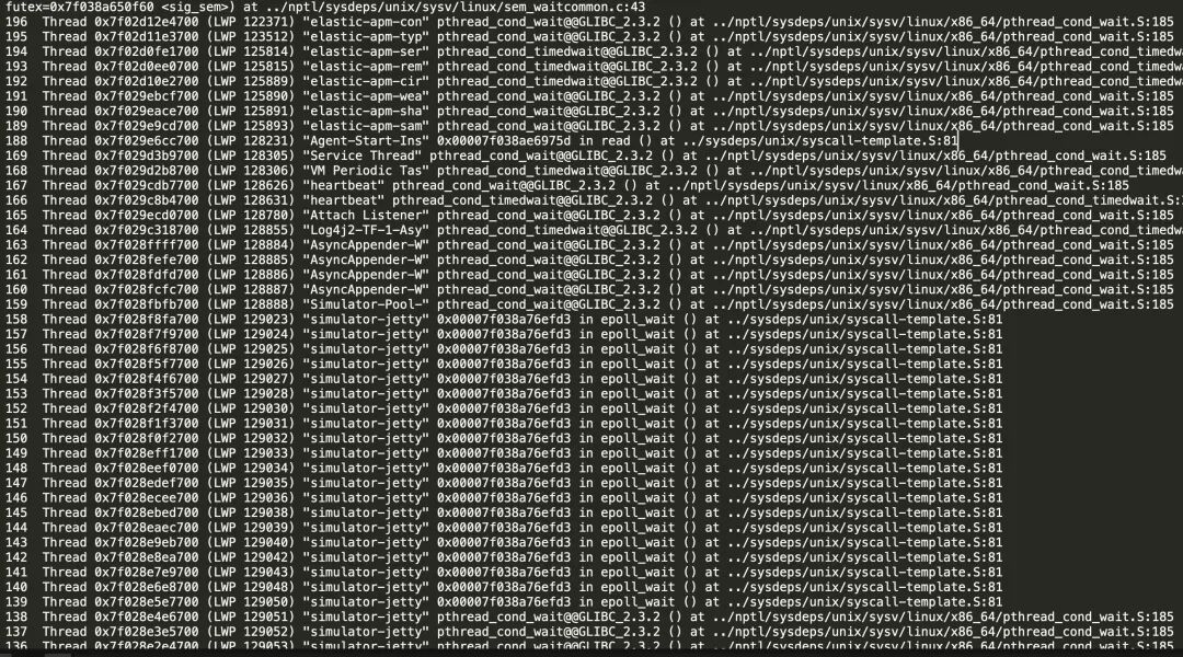 首先 gdb attach 上 jvm 进程,使用 thread apply all bt,可以找到十几个处于 block 状态的线程,