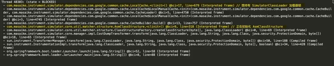 | 主线程 48303 | 初始化 A**ClassStructure 类ing | 想持有 SimulatorClassLoader 锁 |