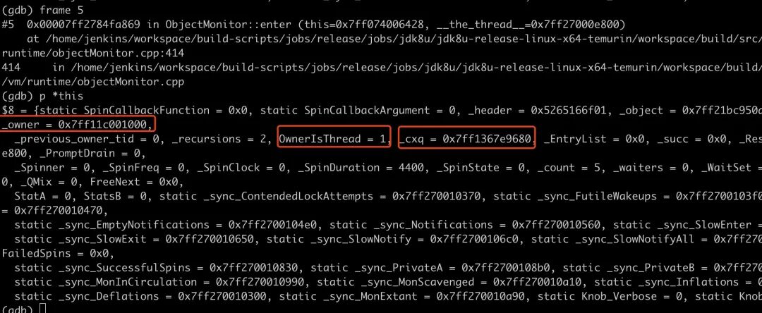 我们切换到 5 号栈帧,也就是 ObjectMonitor::enter,看下到底是谁持有了这个