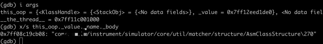 (gdb) x/s this_oop._value._pool_holder._class_loader_data._class_loader._metadata._klass._name._body