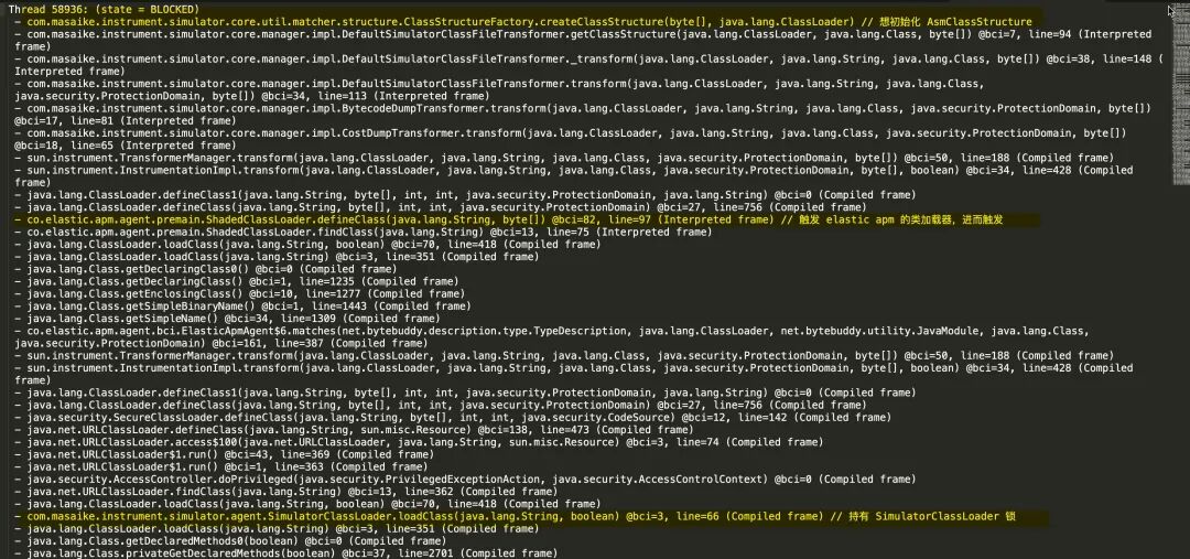 可以看到 58936 号线程持有了 SimulatorClassLoader 类加载器锁,但它自己也因为要初始化某个类而进入了等待状态。