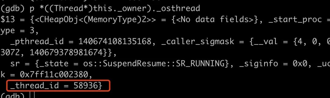 ObjectMonitor 类中有一个 _owner 表示持有这个对象锁的线程是谁。通过 p 命令就可以知道 owner 对象的线程 id 是多少了。