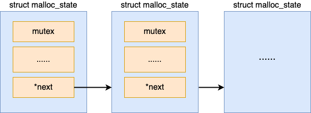 再看下 next 指针。通过这个指针,ptmalloc 把所有的分配区都以一个链表组织了起来,方便后面的遍历。