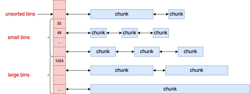 而且每两个相邻的 largebin 之间管理的内存块大小不再是固定的等差数列。这是为了用较少的链表数来更大块空闲内存的管理。