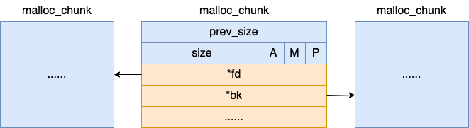 如果我们在开发中调用 free 释放内存的话,其对应的 chunk 对象其实并不会归还给内核。而是由 glibc 又组织管理了起来。其 body 部分的 fd、bk 字段分别是指向上一个和下一个空闲的 chunk( chunk 在使用的时候是没有这两个字段的,这块内存在不同场景下的用途不同),用来当双向链表指针来使用。