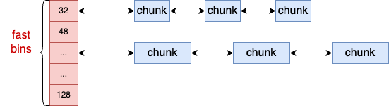 fastbin 中有多个链表,每个 bin 链表管理的都是固定大小的 chunk 内存块。在 64 位系统下,每个链表管理的 chunk 元素大小分别是 32 字节、48 字节、......、128 字节 等不同的大小。