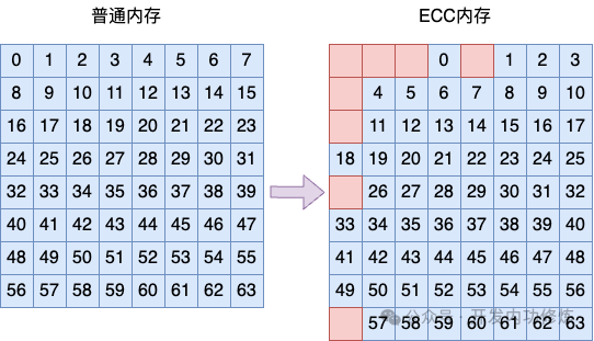 相比没有使用 ECC 技术的个人电脑内存,内存颗粒中全部都用来存储数据即可。在 ECC 内存中每 64 比特的数据都需要额外的 8 比特数据作为校验位,用来辅助发现或者纠正错误。