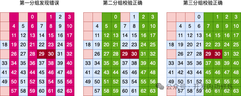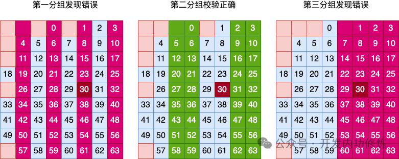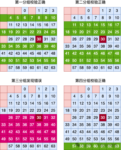 我们假设用户数据的第 29、第 30 比特位发生了错误。那么由于是同时发生了两个错误,那么整个矩阵中的校验肯定是无法发现的,校验通过。