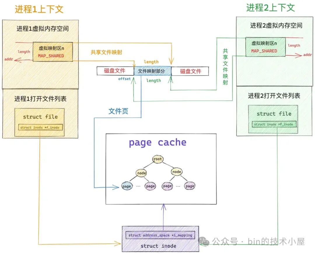 另一种就是文件映射,用于将磁盘文件中的某段区域与进程虚拟内存空间中文件映射与匿名映射区里的某段虚拟内存区域进行关联映射。后续我们针对这段映射内存的读写就相当于是对磁盘文件的读写了,整个读写过程没有数据的拷贝,也没有切态的发生(这里特指在完成缺页处理之后)。