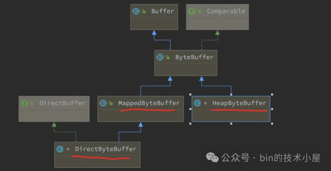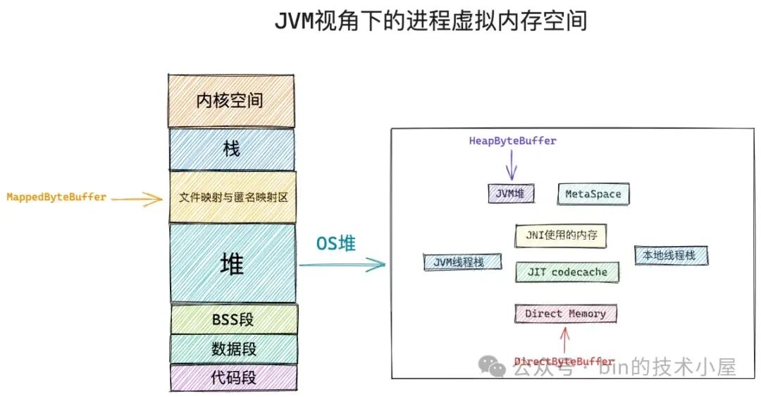 而 JDK Buffer 也会根据其背后所依赖的虚拟内存在进程虚拟内存空间中具体所属的虚拟内存区域而演变出 HeapByteBuffer , MappedByteBuffer , DirectByteBuffer 。这三种不同类型 ByteBuffer 的本质区别就是其背后依赖的虚拟内存在 JVM 进程虚拟内存空间中的布局位置不同。