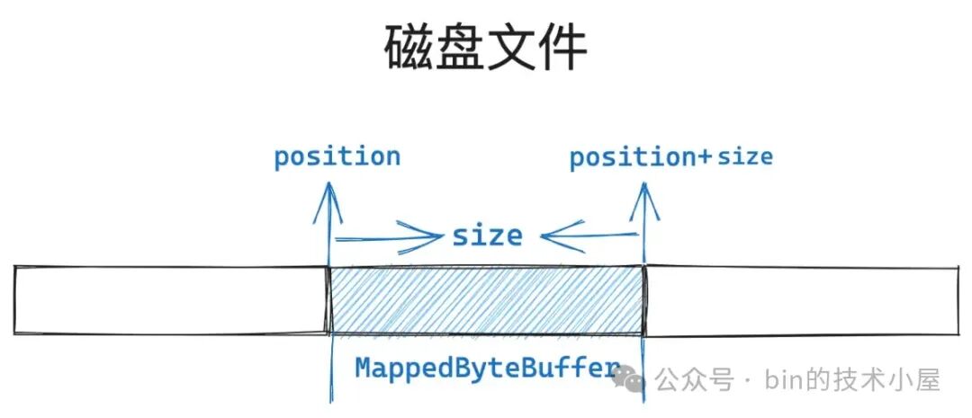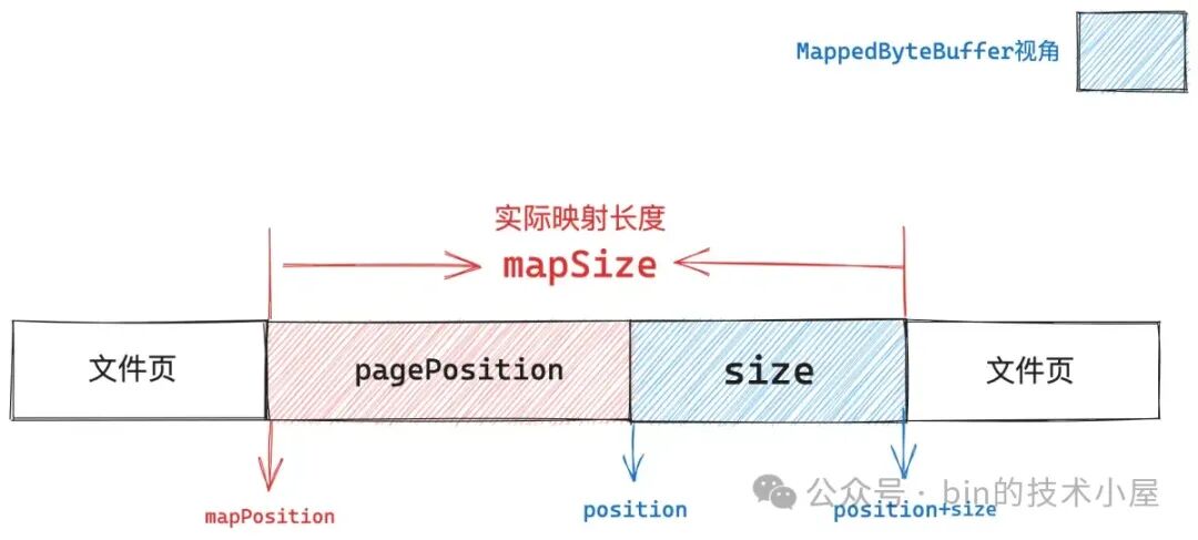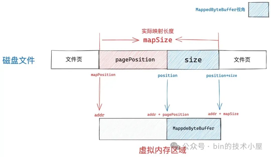 这段被内核拿来用作文件映射的虚拟内存区域在 Java 层面的表现形式就是 JDK 中的 MappedByteBuffer,在 OS 内核中的表现形式是 vm_area_struct。