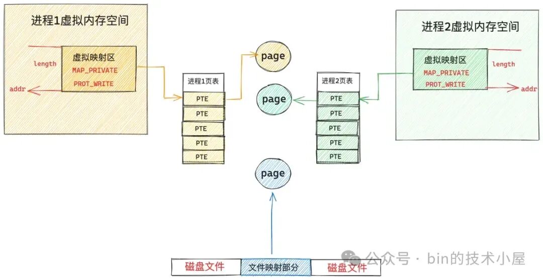 文件映射有私有文件映射和共享文件映射之分,我们在使用 mmap 系统调用的时候,通过将参数 flags 设置为 MAP_PRIVATE,然后指定参数 fd 为映射文件的 file descriptor 来实现对文件的私有映射。通过将参数 flags 设置为 MAP_SHARED 来实现对文件的共享映射。