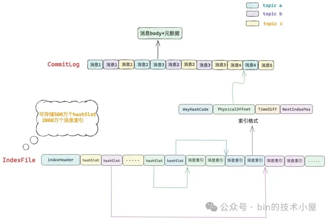 消息索引就存放在各个哈希槽指向的这个链表中,按照消息的生产时间从近到远依次排列。一个 IndexFile 可以容纳 2000W 条消息索引,每条消息索引占用 20 个字节,分别是:消息 key 的 hashcode (4字节),消息在 CommitLog 中的物理偏移 Physical Offset (8字节),Time Diff(4字节),Next Index Pos(4字节)用于指向该消息索引在哈希链表中的下一个消息索引。这里的 Time Diff 指的是消息的存储时间与 beginTimestamp 的差值,而 beginTimestamp 表示的是 IndexFile 中所有消息的最小存储时间。