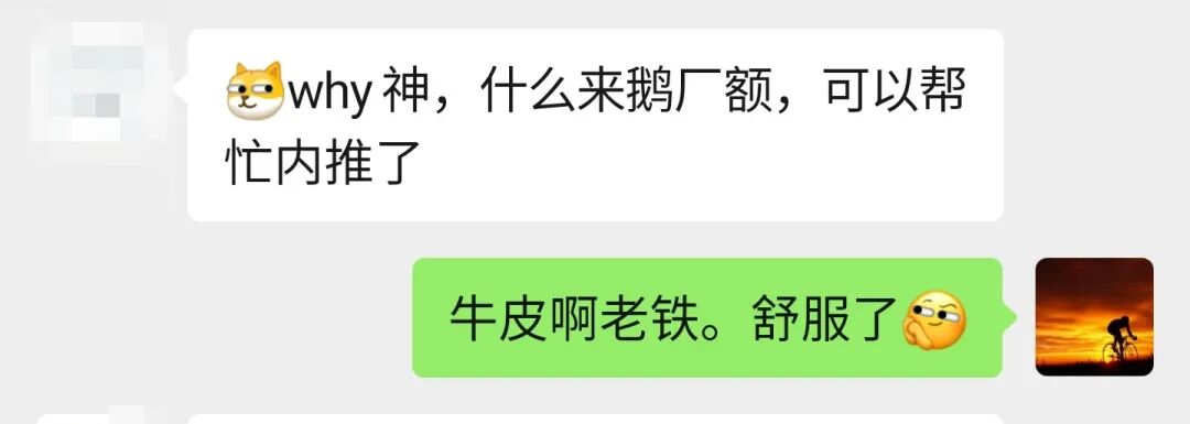 你说这问题对我来说那不是超纲了吗?我也没在大厂体验过啊。所以我怀疑他不讲武德,来骗,来偷袭我这个老实巴交的小号主,我希望他能耗子尾汁,在鹅厂好好发展: