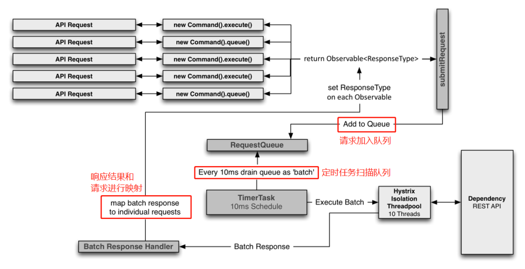 很明显,这个时候我们就可以做请求合并。每收到 10 次请求,合并为一次处理,结合 Hystrix 代码就是这样的,为了代码的简洁性,我采用的是注解方式: