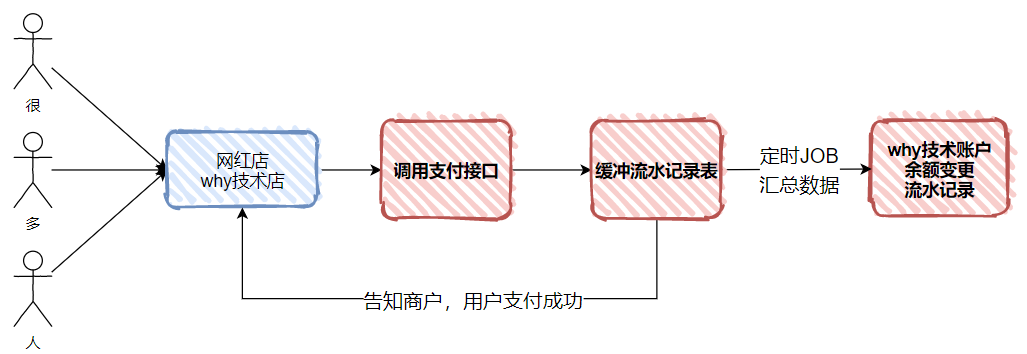 当记录进入缓冲流水记录表之后,我们就可以通知商户用户支付成功了,至于钱,你放心,我有定时任务,一会就到账: