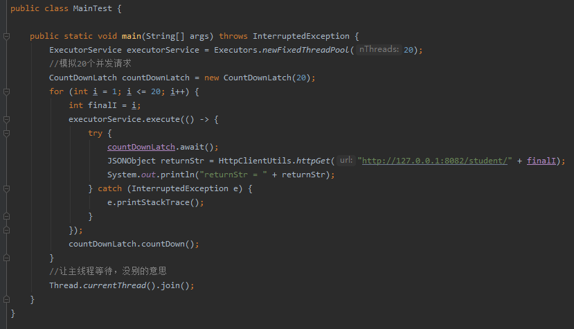 服务启动起来后,我们用线程池结合 CountDownLatch 模拟 20 个并发请求: