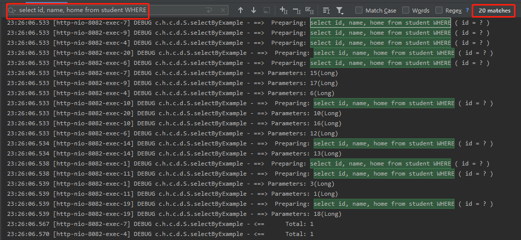 从控制台可以看到,瞬间接受到了 20 个请求,执行了 20 次查询 sql: