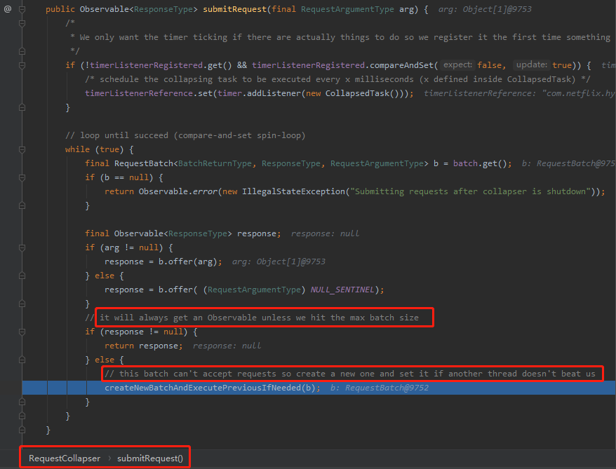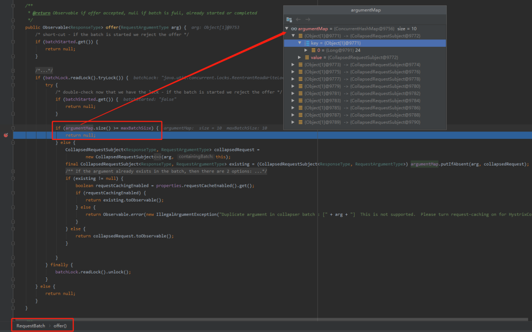 可以看到,在com.netflix.hystrix.collapser.RequestBatch#offer方法中,当 argumentMap 的 size 大于我们指定的 maxBatchSize 的时候返回了 null。