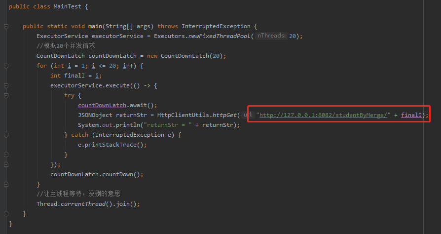 同样,我们用线程池结合 CountDownLatch 模拟 20 个并发请求,只是变换了请求地址: