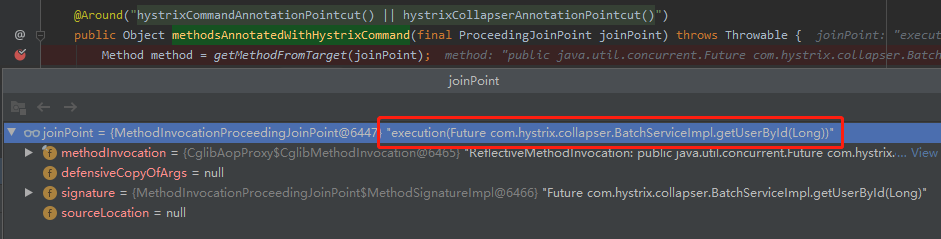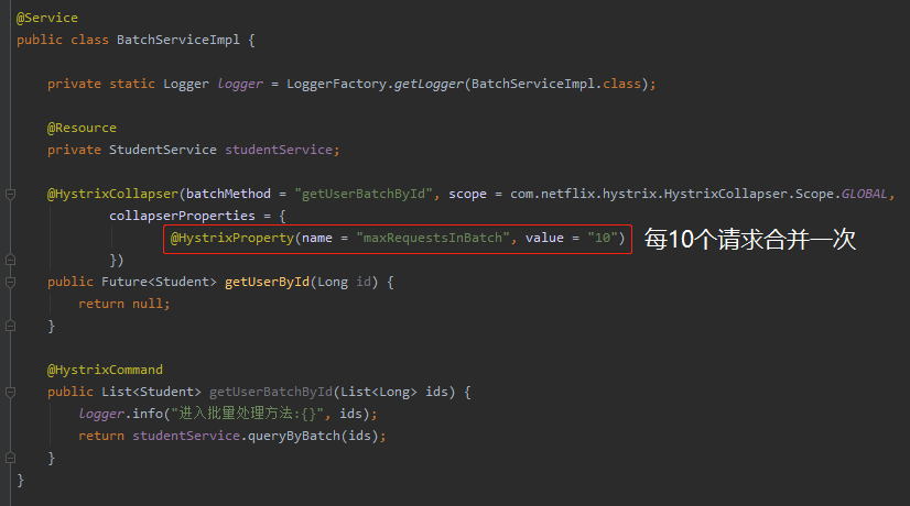 在 @HystrixCollapser 里面可以看到有一个 batchMethod 的属性,其值是 getUserBatchById。