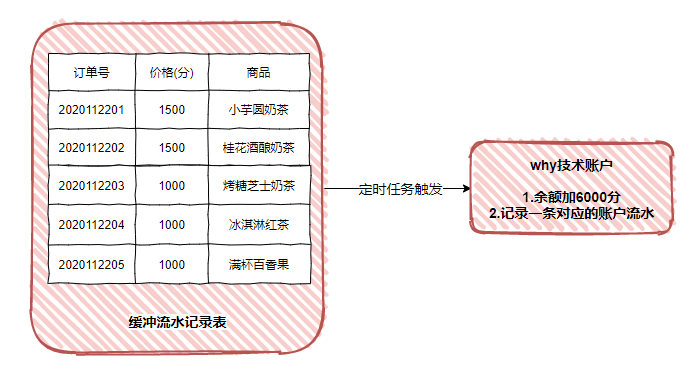 如果我们把缓冲流水记录表看作是一个队列。那么这个方案抽象出来就是队列加上定时任务。
